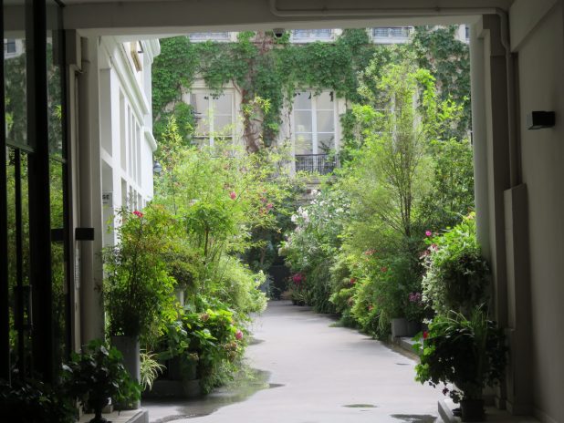 Jolie cour fleurie dans une rue du quartier du Marais, Paris centre.