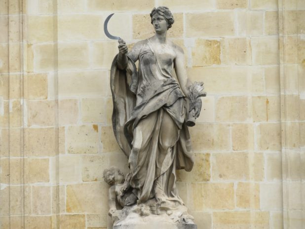 Nids d’hirondelles dans la chevelure de Méduse, sur le palais du Louvre, Paris centre.