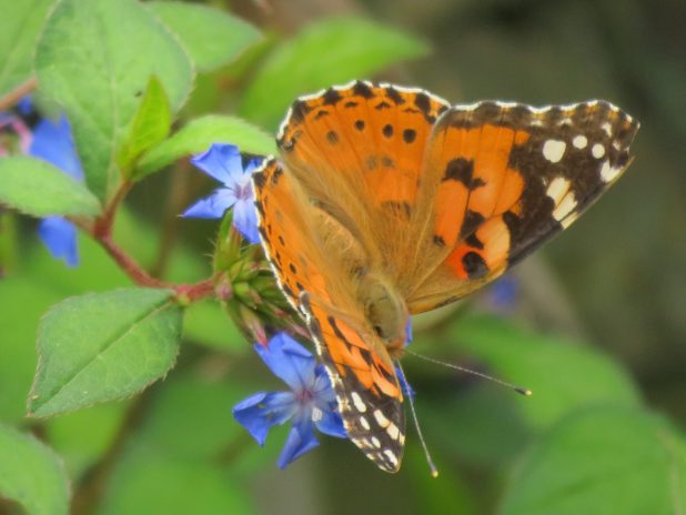Vanesse du chardon butinant un Ceratostigma dans le jardin des Présentateurs à Bagatelle, 16e.