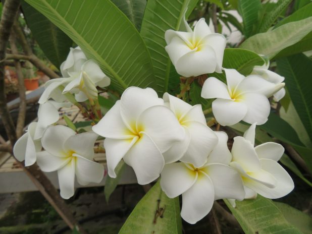 Belle variété de frangipanier chez Julien Mallet, pépinières Nature & Tropiques à Carqueiranne, 83.