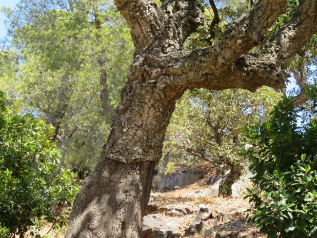 Vieux chêne liège avec trace de démasclage sur le tronc, à la Colle noire de Carqueiranne, 83.