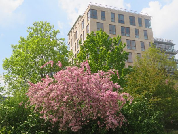 Floraisons dans le jardin des Grands moulins-Abbé Pierre, quartier Paris rive gauche, 13e.
