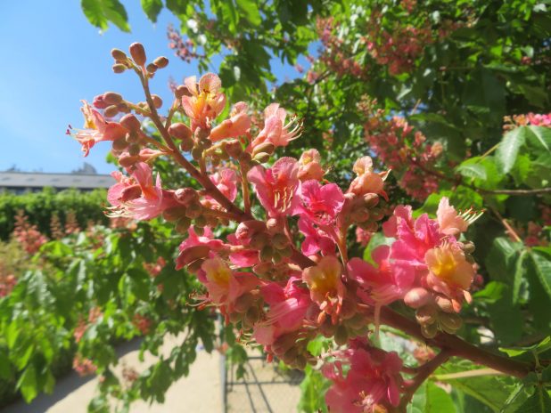 Inflorescence de marronnier à fleurs rouges au jardin des Tuileries, Paris centre.