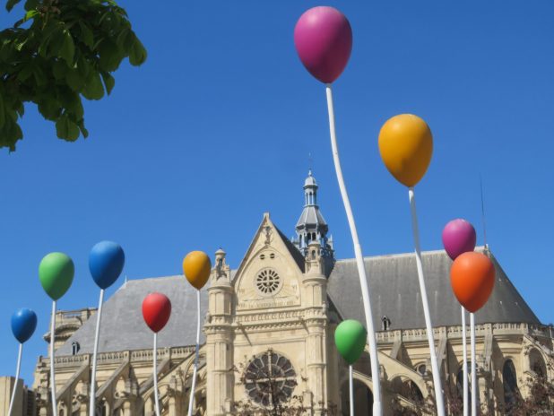Lâcher de ballons permanent devant l’église st Eustache, depuis le jardin Nelson Mandela, Paris centre.