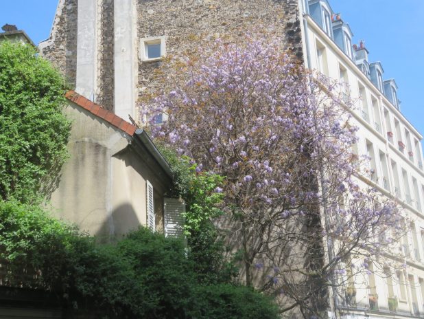 Glycine de Chine, installée dans la ramure d’un ailante, quartier de la Goutte d’Or, 18e.