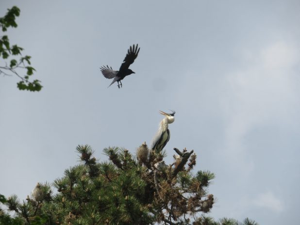 Héron cendré harcelé par une corneille sur la mare st James, près de la folie st James, à Neuilly, 92.