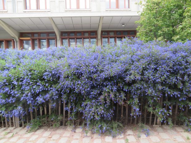 Impressionnant massif de céanothes, Ceanothus sp, au jardin Françoise Hélène Jourda, quartier de la Chapelle, 18e.