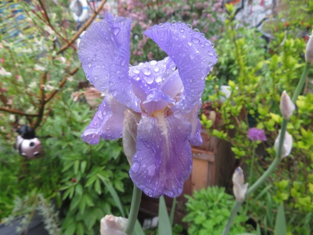 Iris pallida sous la pluie, en bac au jardin partagé Ecobox, quartier de la Chapelle, 18e.