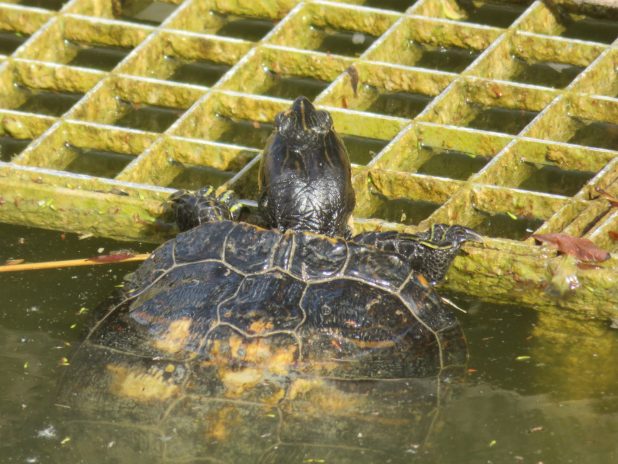 Tortue de Floride, émergeant d’un bassin du Parc de Bercy, 12e.