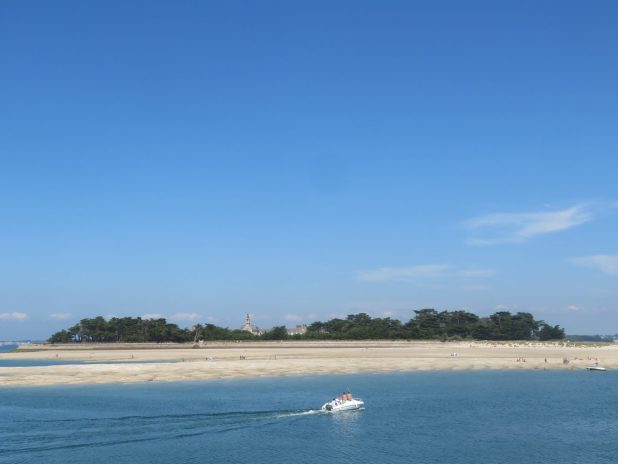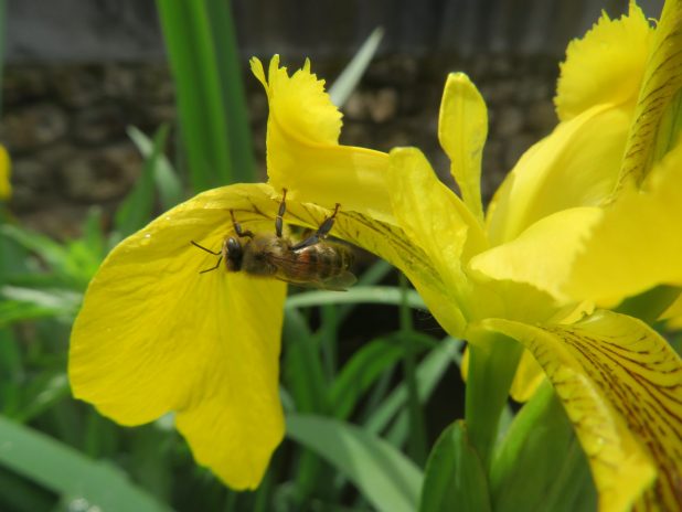 Abeille sur iris des marais, dans le canal du jardin d’Eole, 18e.