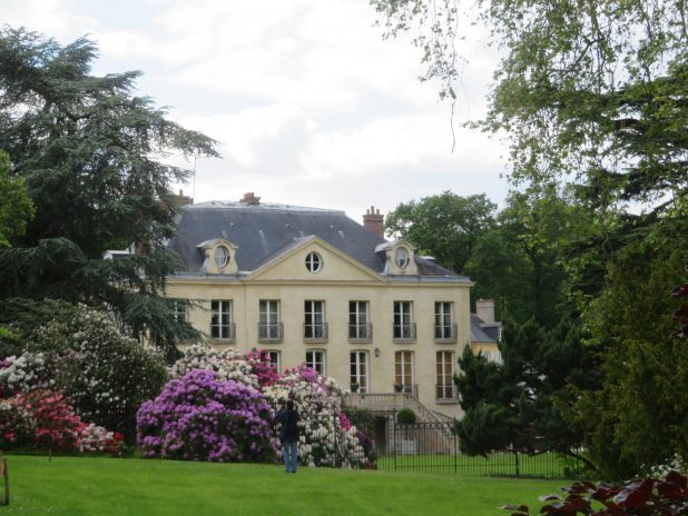 Rhododendrons en fleurs devant la folie, à l’arboretum de la Vallée aux Loups, 92.
