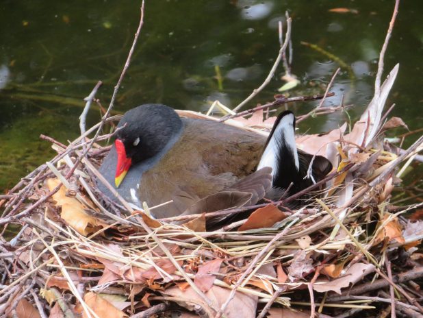 Poule d’eau assoupie en pleine couvaison, au parc de Bercy, 12e.