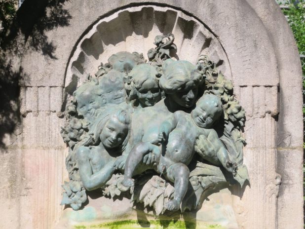 Enfant incontinent sur la fontaine des Innocents d’Emile Derré, dans le jardin Louise Michel à Montmartre,18e.