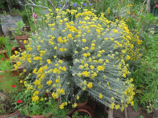 » Plante curry » en fleurs dans le jardin partagé Ecobox, quartier de la Chapelle, 18e.