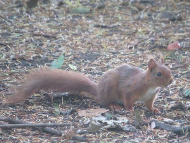 Ecureuil roux aux aguets dans un sous bois du parc de Sceaux, 92.