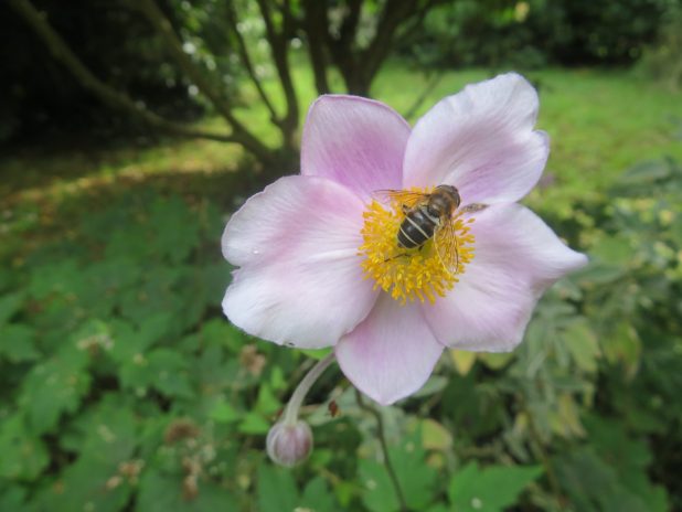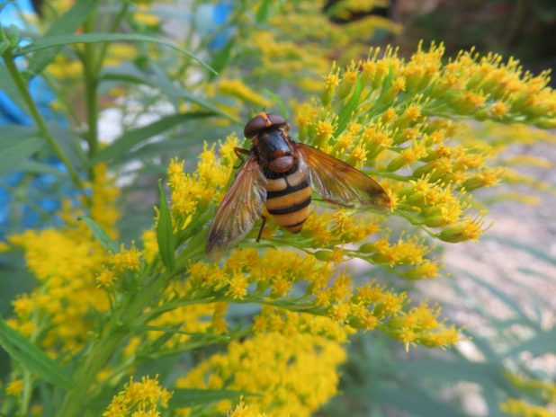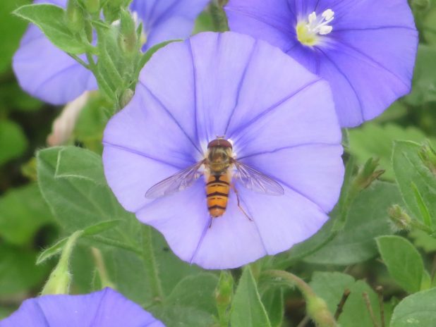 Syrphe ceinturé butinant un liseron de Mauritanie, à l’arboretum de la Vallée aux Loups, 92.