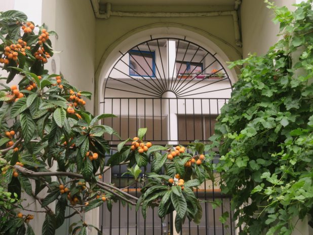 Néflier du Japon, chargé de fruits dans la Villa Poissonnière, quartier de la Goutte d’Or, 18e.