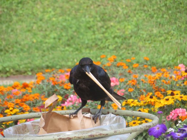 Corneille noire amatrice de gastronomie asiatique, au jardin du Luxembourg, 6e.