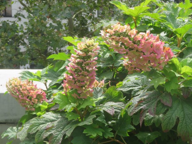 Belles inflorescences d’Hydrangea quercifolia, au jardin Cyprian Norwid, quartier Paris rive gauche,13e.