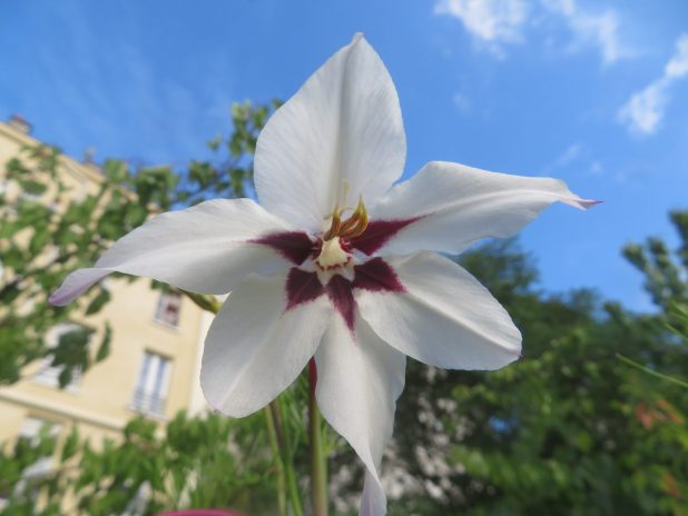 Glaieul d’Abyssinie au jardin partagé Ecobox, quartier de la Chapelle, 18e.