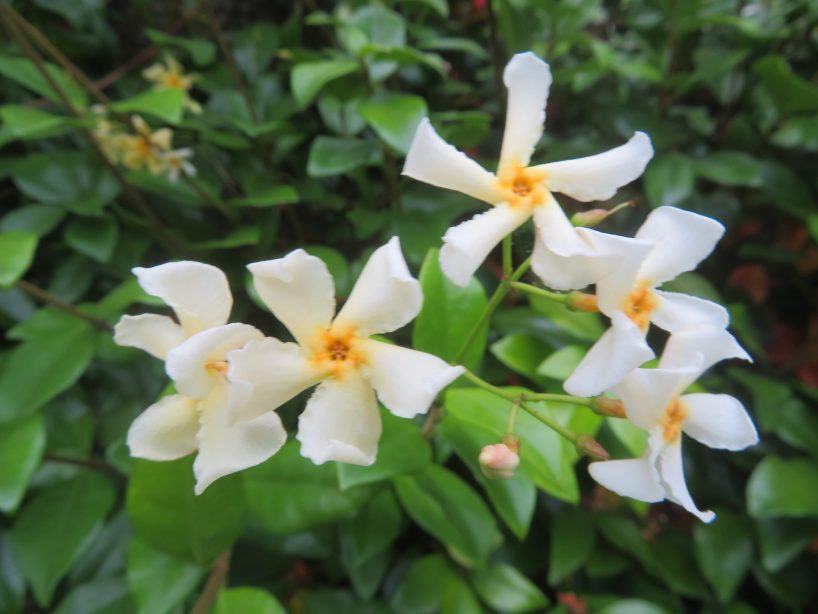 Boules d’oranger du Mexique, Choisya ternata ‘White Dazzler’, dans le coin des enfants, au jardin Nelson Mandela, Paris centre.