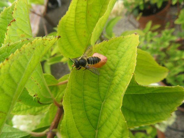 Mégachille ou abeille tapissière, et son pétale de rose en guise de tapis volant, sur une terrasse du quartier de Montmartre, 18e.