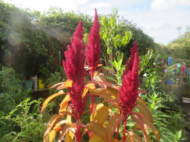 Célosie, Celosia argentea ‘ plumosa ‘, au jardin partagé Ecobox, quartier de la Chapelle, 18e.