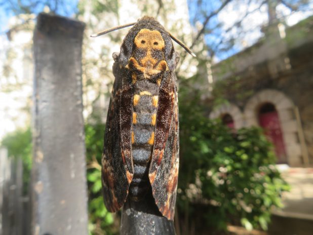 Impressionnant sphinx tête de mort, au pied de l’église ND de la Croix, quartier de Ménilmontant, 20e.