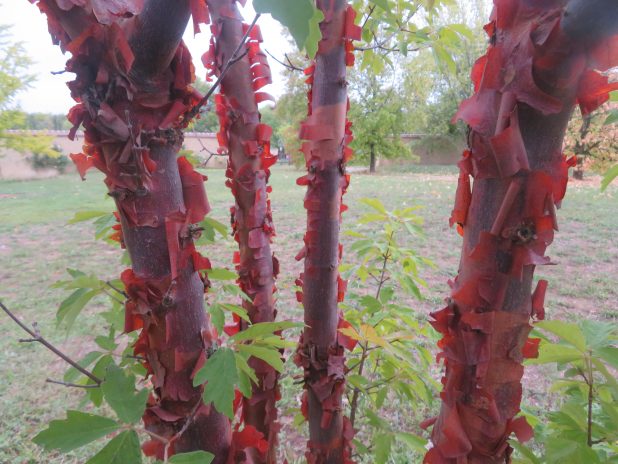 Desquamations sur des troncs d’érable, Acer griseum, à l’arboretum de la Vallée aux Loups, 92.