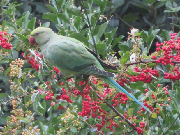 Perruche à collier se délectant de fruits de Pyracantha, au parc Montsouris, 14e.