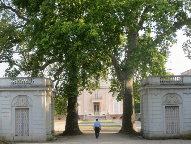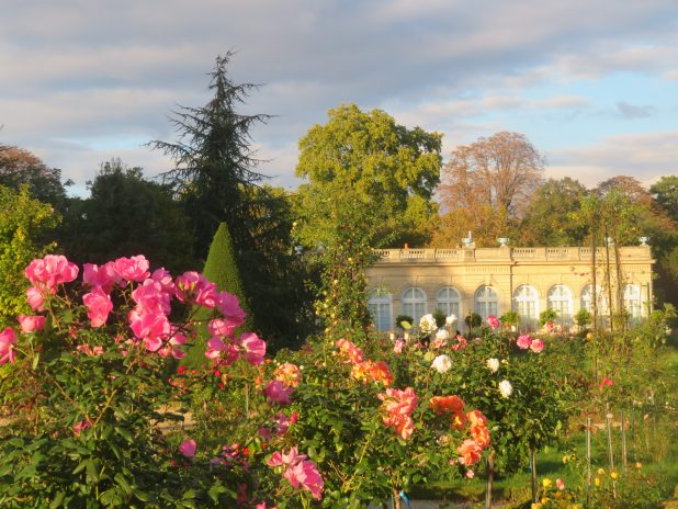 Belle lumière vespérale sur la roseraie et l’orangerie du jardin de Bagatelle, 16e.