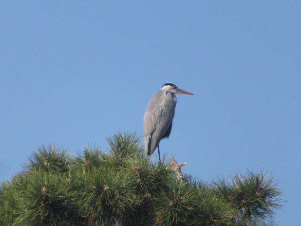 Héron cendré, haut perché dans la pinède du parc floral, 12e.