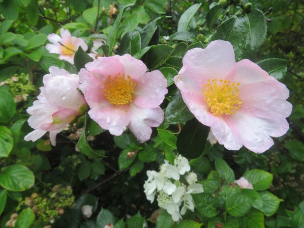 Floraison d’un Camellia sasanqua, dans la collection d’Hydrangea, à l’arboretum de la Vallée aux Loups, 92.