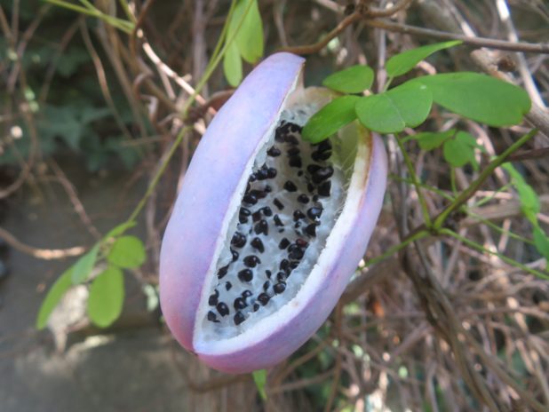 Fruit d’Akebia quinata, spectaculaire et comestible, au jardin des serres d’Auteuil, 16e.