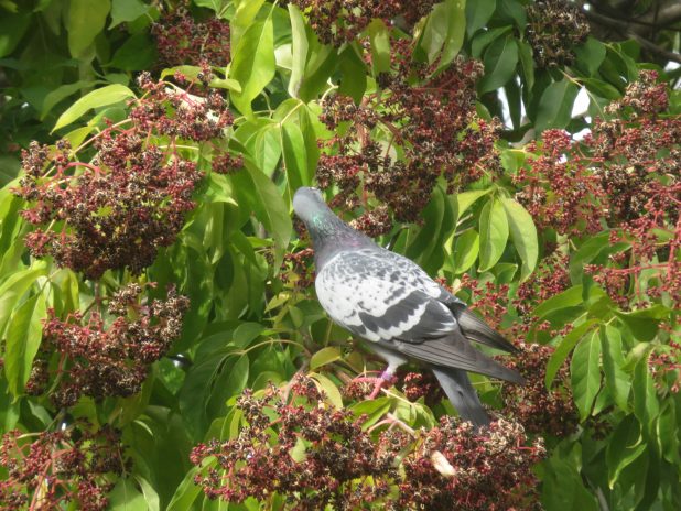 Pigeon, Columba livia, se délectant de graines d’arbre à miel, Tetradium daniellii, au parc de l’Île st Germain, 92.