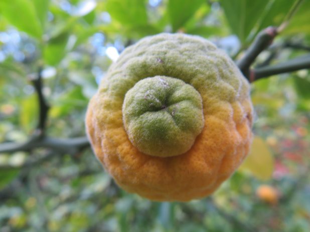 Fruit renfrogné de poncirier, Poncirus trifoliata, au Parc floral, 12e.