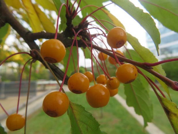 Petites pommes d’un Malus sieboldii, au jardin des Grands moulins-Abbé Pierre, quartier Paris Rive Gauche, 13e.