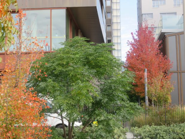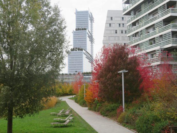 Flamboiement des érables rouges et du frêne ‘ Raywood ‘, au jardin Martin Luther King, sur fond de cité judiciaire par l’architecte Renzo Piano, 17e.