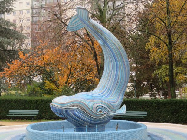 Fontaine de la baleine bleue dans le jardin st Eloi, sur le parcours de la future balade dans le quartier de Reuilly, 12e.