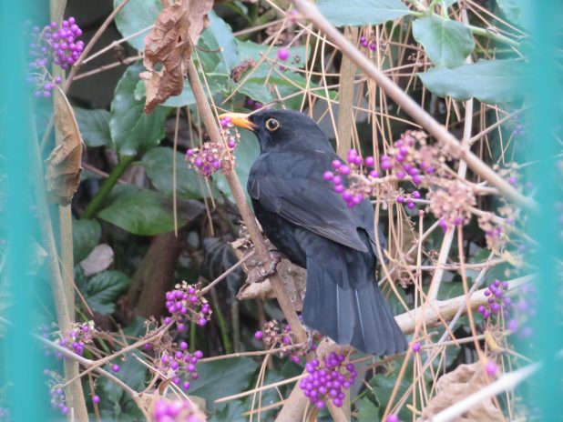 Merle noir se gobergeant de baies de Callicarpa, dans le jardin st Eloi, sur le trajet de la future balade dans le quartier de Reuilly.