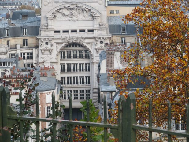 Entrée des anciens grands magasins Dufayel, depuis le jardin Louise Michel, quartier de Montmartre.