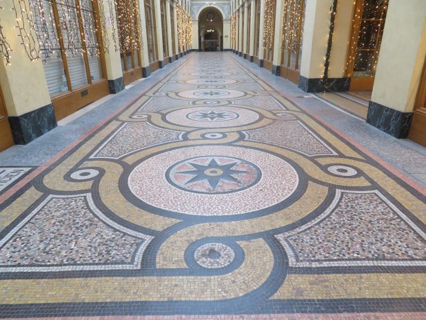 Mosaïques de Giandomenico Faccina, 1826-1903, au sol de la galerie Vivienne, sur le parcours des passages de l’Ouest.
