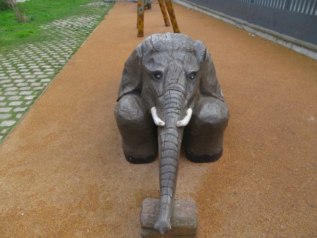 Eléphant/jeu d’enfants, au jardin Françoise Hélène Jourda, quartier de la Chapelle, 18e.