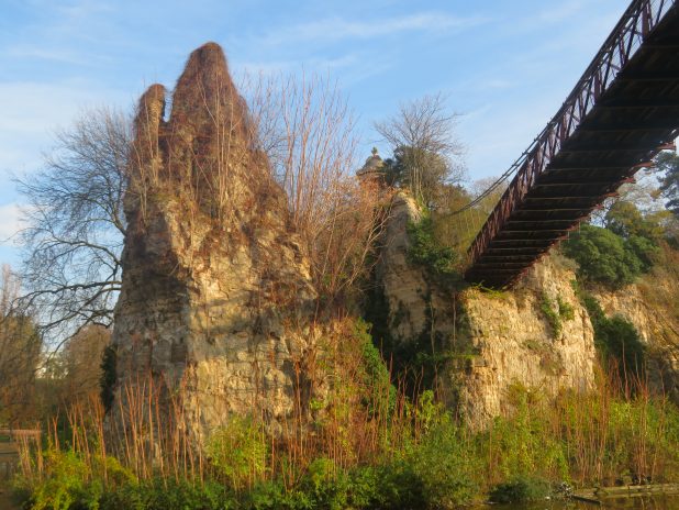 Falaises surplombant le lac, au parc des Buttes Chaumont, 19e.