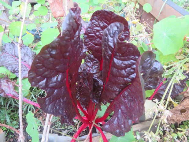 Vaillante blette à carde rouge, en pleine forme au jardin partagé Ecobox, quartier de la Chapelle, 18e.