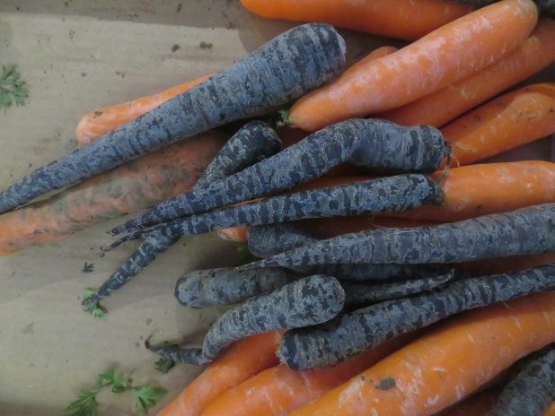 Jolies carottes sombres, à préparer pour une des deux distributions journalières de repas gratuits, par l’association la Table ouverte, quartier de la Goutte d’Or, 18e.