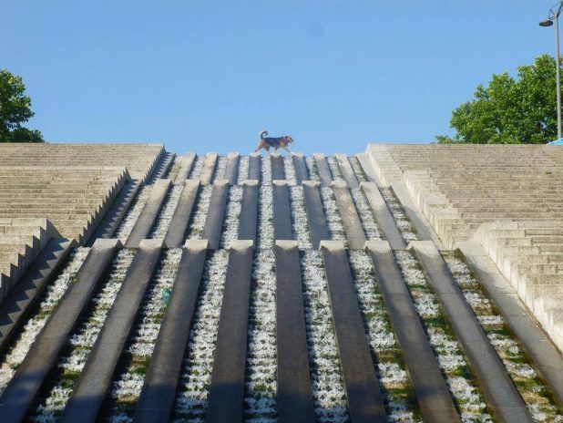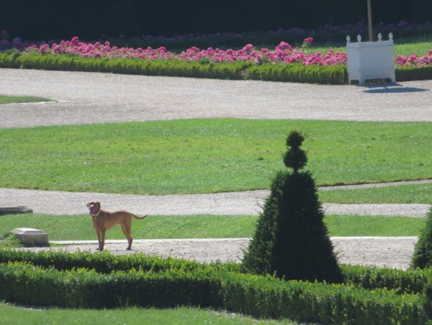 Chien en goguette sur la grande terrasse du Parc de Bercy, 12e.