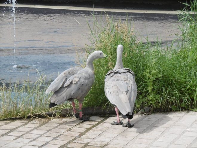 Couple de céréopses cendrées, jolies oies australienne, au jardin d’acclimatation, 16e.