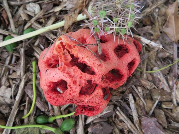 Clathre rouge dans le jardin des Métamorphoses, au parc André Citroën, 15e.