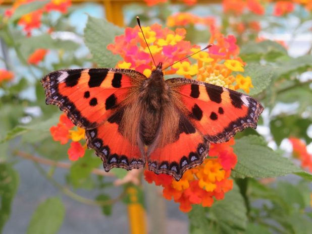 Petite tortue butinant un Lantana camara, dans le pavillon des papillons du Parc floral, 12e.